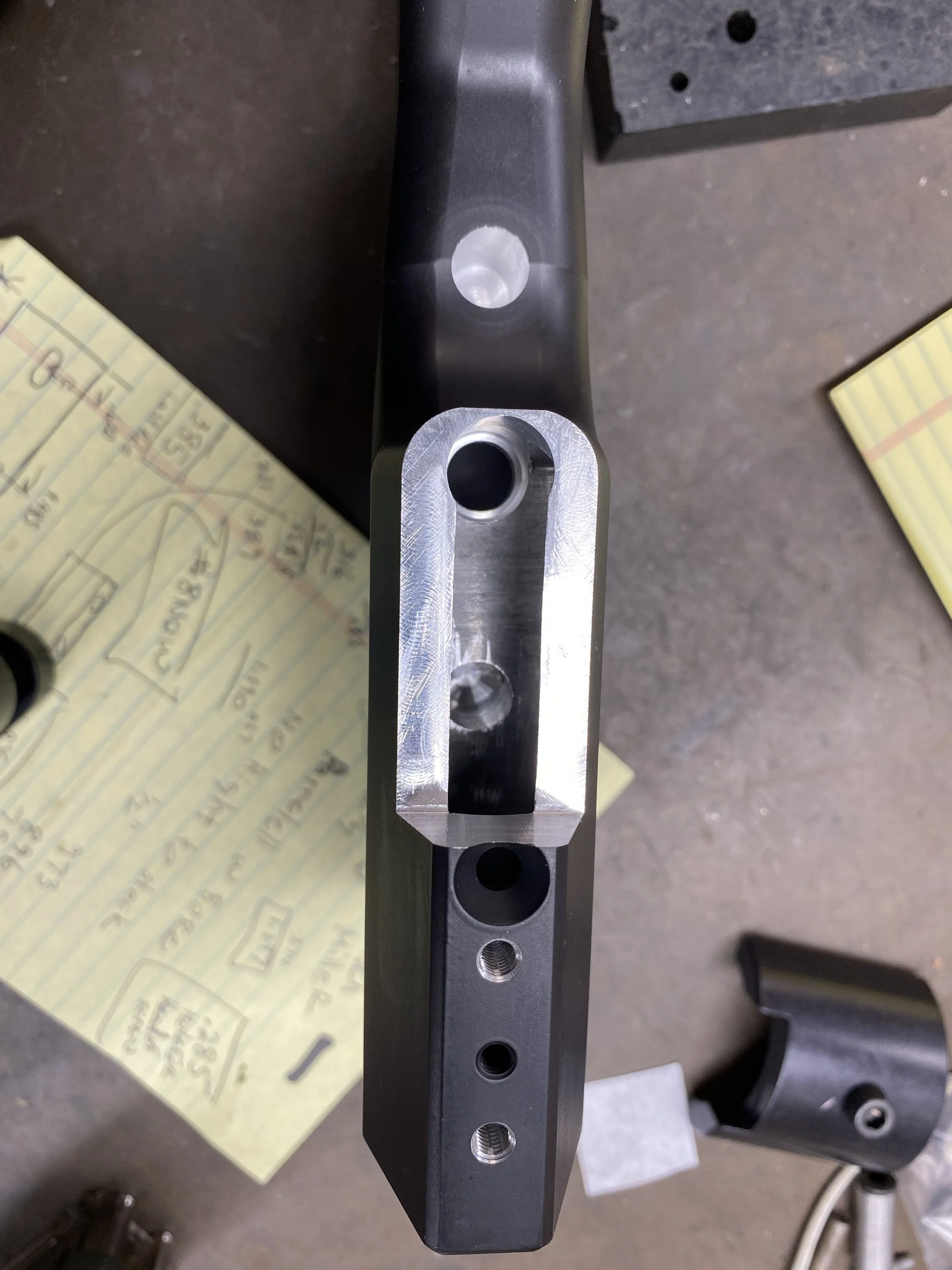 Milling out the forward lower area to make room for the Flat Mount ABR. Milling holes for dowel and stud clearance and adding new mounting holes in the stock.